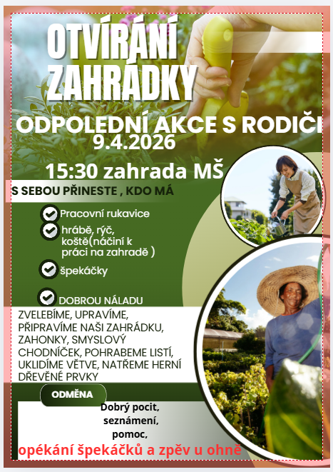 AKCE OTVÍRÁNÍ ZAHRADÁKY - SPOLEČNĚ DĚTEM PŘIPRAVÍME ZAHRÁDÁKU, POHRABEME LISTÍ, UPRAVÍME SMYSLOVÝ CHODNÍČEK, NATŘEME HERNÍ PRVKY, ZAMETEME A ODKLIDÍME VĚTVE A DALŠÍ.